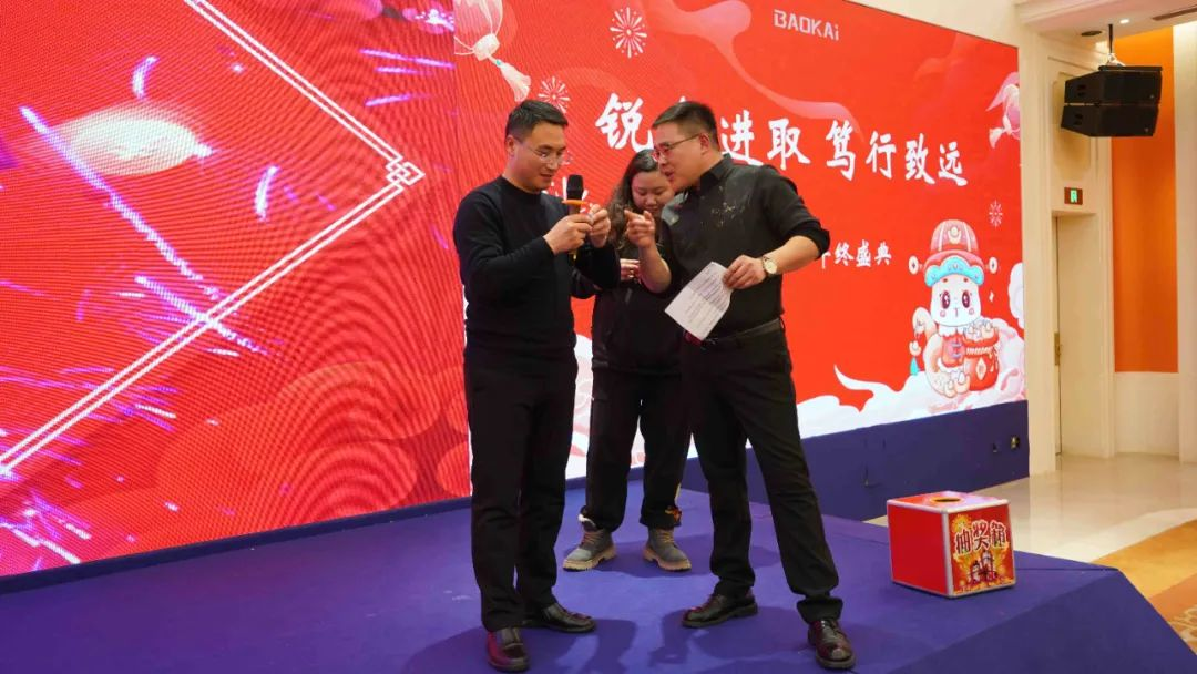 当晚,宝开2025年终盛典在白金汉爵大酒店召开。营销部宋龙、财务部丁俊营担任主持人。
